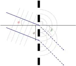 Lorsque la lumière est incidente sur un réseau de transmission, elle n'est réfléchie ou transmise qu'en certains points, les traits du réseau. Chaque trait diffuse la lumière dans toutes les directions, et ces ondes interfèrent (voir image). Comme les traits sont disposés de manière régulière, on a une alternance interférence constructive/interférence destructive selon l'angle de diffusion. On peut ainsi calculer, pour une longueur d'onde λ donnée, les angles θm pour lesquels on aura une interférence constructive[2],[3].