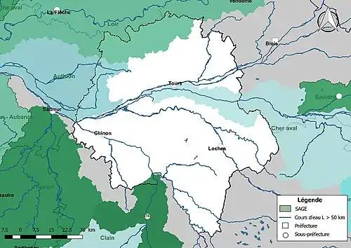 Le schéma d'aménagement et de gestion des eaux (SAGE) est un outil de planification au périmètre plus restreint que le SDAGE. Il est fondé sur une unité de territoire où s’imposent une solidarité physique et humaine (bassins versants, nappes souterraines, estuaires…). Il fixe les objectifs généraux, les règles, les actions et moyens à mettre en œuvre pour gérer la ressource en eau et concilier tous ses usages. Le SAGE est élaboré par une commission locale de l’eau (C.L.E.) composée d’élus, d’usagers et de représentants de l’État. Il doit être approuvé par le Préfet après avis du comité de bassin pour devenir opposable aux décisions publiques. Les SAGE doivent être compatibles avec les orientations du SDAGE en application sur leur territoire[17]. Trois SAGE concernent le département d'Indre-et-Loire.