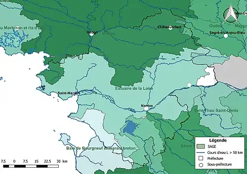 Le schéma d'aménagement et de gestion des eaux (SAGE) est un outil de planification au périmètre plus restreint que le SDAGE. Il est fondé sur une unité de territoire où s’imposent une solidarité physique et humaine (bassins versants, nappes souterraines, estuaires…). Il fixe les objectifs généraux, les règles, les actions et moyens à mettre en œuvre pour gérer la ressource en eau et concilier tous ses usages. Le SAGE est élaboré par une commission locale de l'eau (C.L.E.) composée d’élus, d’usagers et de représentants de l’État. Il doit être approuvé par le Préfet après avis du comité de bassin pour devenir opposable aux décisions publiques. Les SAGE doivent être compatibles avec les orientations du SDAGE en application sur leur territoire[18]. Quatre SAGE concernent le département de la Loire-Atlantique : Estuaire de la Loire, Baie de Bourgneuf et marais breton, Evre Thau Saint-Denis et bassin de la Vilaine[19].