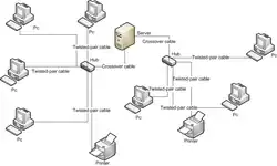 Les infrastructures ou supports peuvent être sur des câbles dans lesquels circulent des signaux électriques, l'atmosphère (ou le vide spatial) où circulent des ondes radio, ou des fibres optiques qui propagent des ondes lumineuses. Elles permettent de relier « physiquement » des équipements assurant l'interconnexion des moyens physiques qui sont définis par des protocoles. Les équipements d'un réseau sont connectés directement ou non entre eux, conformément à quelques organisations types connues sous le nom de topologie de réseau. Les principaux types de réseaux filaires pour les réseaux informatiques d'entreprises ou de particuliers utilisent les protocoles suivant qui proviennent du standard Ethernet :