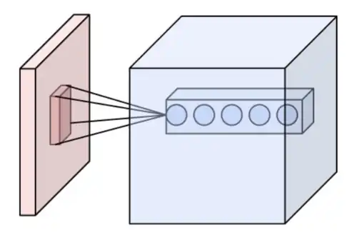 Si le pas et la marge appliquée à l'image d'entrée permettent de contrôler le nombre de champs récepteurs à gérer (surface de traitement), la profondeur permet d'avoir une notion de volume de sortie, et de la même manière qu'une image peut avoir un volume, si on prend une profondeur de 3 pour les trois canaux RVB d'une image couleur, la couche de convolution va également présenter en sortie une profondeur. C'est pour cela que l'on parle plutôt de « volume de sortie » et de « volume d'entrée », car l'entrée d'une couche de convolution peut être soit une image soit la sortie d'une autre couche de convolution.
