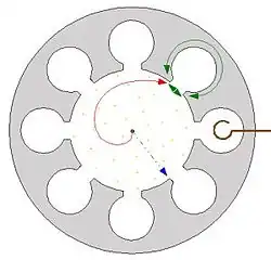 La cathode du magnétron est chauffée et produit des électrons libres qui se dirigent naturellement vers l'anode. Cependant, ils sont déviés vers la droite dès qu’on applique un champ magnétique perpendiculairement à la trajectoire du faisceau. Les électrons induisent un courant dans les parois des cavités qui varie alternativement avec l'approche et le passage des électrons de telle façon qu'une onde est créée dans chaque cavité. Celle-ci interfère avec le faisceau d'électrons pour les regrouper en bras tournant dans l'espace d'interaction. Cet échange entre les cavités et le faisceau d'électrons se stabilise à la fréquence de résonance des cavités. L'onde produite est utilisée dans les radars autant que dans les fours à micro-ondes.