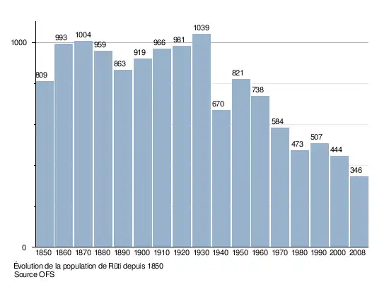 Selon l'Office fédéral de la statistique, Rüti possède 364 habitants fin 2023[2]. Sa densité de population atteint 59 hab./km².