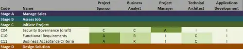 Les lignes de la matrice référencent les activités identifiées, et les colonnes les rôles (personnels impliqués par métier). Dans chaque cellule [activité ; rôle] figure la lettre « R », « A », « C » et/ou « I », où l'acronyme anglais RACI signifie :