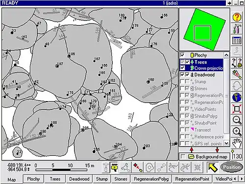 Exemple de la cartographie des arbres (projection horizontale du houppier) sur un placette permanente.