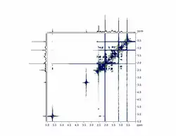 Dans une expérience de spectroscopie RMN bidimensionnelle, le résultat est un spectre en trois dimensions : le déplacement chimique pour le noyau 1 (δ1), le déplacement chimique pour le noyau 2 (δ2) et l'intensité du signal. Un tel spectre est représenté sur un écran ou une feuille de papier en dessinant les axes δ1 et δ2 dans le plan de l'écran ou de la feuille et en reliant les points d'intensité égale (positive ou négative) par des lignes.