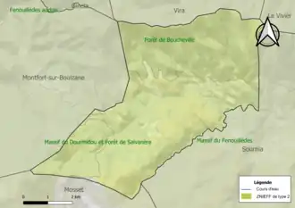 - la « forêt de Boucheville » (4 928 ha), couvrant 8 communes dont deux dans l'Aude et six dans les Pyrénées-Orientales[15] ;