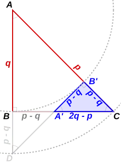 Soit un triangle isocèle rectangle en et de côtés entiers. Alors, le cercle centré en de rayon la longueur du petit côté coupe l'hypoténuse en un point tel que soit encore de longueur entière, puisque et le sont. La perpendiculaire menée en à l'hypoténuse coupe le côté en . Le triangle est isocèle rectangle en , puisque l'angle en est droit et l'angle en est celui du triangle d'origine. Les droites et sont les tangentes issues de au cercle de centre et de rayon , et donc , donc , et est de longueur entière[10]. On peut aussi interpréter la construction comme le pliage du triangle dans lequel on ramène le côté sur l'hypoténuse[11].