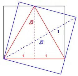 La racine carrée de 6 apparaît dans divers autres contextes géométriques, comme la longueur du côté du carré circonscrit à un triangle équilatéral de côté 2 (voir figure à gauche).