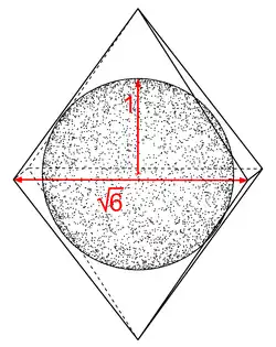 La longueur de l'arête d'un octaèdre régulier est égale à la racine carrée de 6 fois le rayon de la sphère inscrite (c'est-à-dire la distance entre le centre du solide et le centre de chaque face)[11].