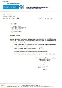 - ↑ Décret 79-757 du 10 juillet 1997, JO du 13 juillet 1997, sur la demande d'autorisation d'appareils d'écoute autre que les récepteurs de radiodiffusion, de bande radioamateur, les postes CB. Les appareils sont soumis à une autorisation du premier ministre/sgdn/den/ssd en application de l'article R 226-7 du code pénal.