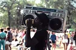Le ghettoblaster a émergé dans les années 1970 aux États-Unis. Conçu initialement pour être un dispositif audio portable capable de jouer de la musique à volume élevé dans des espaces publics, il combinait un lecteur de cassettes, une radio AM/FM, et, dans certains modèles, un enregistreur. Son développement était motivé par la demande croissante d'une expérience musicale collective et mobile, en particulier dans les communautés urbaines où la musique jouait un rôle central dans la vie sociale et culturelle. Les premiers modèles étaient assez volumineux et alimentés par de grandes batteries, ce qui reflétait l'importance accordée à la puissance sonore et à la portabilité.