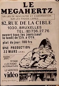- ↑ S’il est vrai qu’à l’automne 1979 les radios libres ont commencé à émettre au grand jour - et même un petit peu plus tôt, si on considère l’ouverture du café « Le mégahertz » comme étant la date officielle de la première émission au grand jour (...), Dix ans après... Les radios libres, Guy Stuckens, Radio Activities, 30 ans de radios libres, 26 juillet 2006
