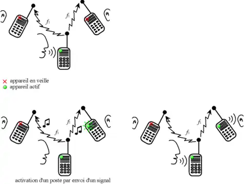 - ↑ Ce mode de fonctionnement correspond aux réseaux radioélectriques analogiques des sapeurs-pompiers français dans la bande 85,500 à 86,950 MHz, issus de la réforme des transmissions des années 1990 (OBNT de la Sécurité civile approuvé par la DSIC du ministère de l'Intérieur, ancienne DTI). Avec la loi de modernisation de la sécurité civile de 2004, ces réseaux et leurs modes de fonctionnement sont réformés pour intégrer les technologies numériques à l'instar des réseaux de la gendarmerie (Rubis en 78 et 77 MHz) et de la police nationale (Acropol en 380 et 390 MHz). Cette réforme numérique, baptisée Antares, doit conduire les services publics qui concourent aux missions de sécurité civile (police, gendarmerie, services départementaux d'incendie et de secours, samu) à disposer dans la gamme de fréquences harmonisée sur le plan européen (380-385 MHz couplé à 390-395 MHz selon la décision CER/DEC/(96)01 de l'ERO), d'un système opérationnel interopérable pour les opérations de secours quotidiennes et lors des situations de crise.