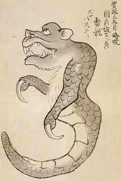 Toutefois, le raijū emprunte également des traits plus viverrins, le rapprochant plus d’un félin comme un chat ou encore celui de mustélidés comme la belette du Japon : Dans le Sunkoku Zasshi, un manuel de géographie locale paru durant l’ère Tenpō, il est écrit qu’un raijū vivait dans le village de Hanazawa, district de Masuda, province de Suruga, aujourd'hui Fujieda dans la préfecture de Shizuoka.Ce raijū était un peu plus grand que deux shaku et dont l’aspect général évoquait Les deux animaux. Il était décrit comme ayant un pelage clair, rougeâtre et noirâtre par endroits, mêlé de poils bruns foncé, avec des taches noires et une longue queue. Ses yeux étaient ronds, ses oreilles petites et semblables à celles d'un rat, et il avait quatre doigts aux pattes antérieurs avec des griffes acérées et recourbées vers l'intérieur. Il se déplaçait parfois sur des nuages lors de violents orages, mais tombait parfois, fendant les arbres en deux et menaçant les humains lors de sa chute[5]. Dans d’autres écrits paru au cours de la période Édo, tels que Hokuroku Sadans, on raconte que le raijū de la province de Shimotsuke (actuelle préfecture de Tochigi) ressemblait à un gros rongeur plus grand qu'une belette du Japon, avec des griffes acérées sur ses quatre pattes. En été, il levait la tête vers le ciel à partir de trous naturels dispersés dans les montagnes, prêt à sauter sur des nuages au moment de l’apparition d'un orage, toujours accompagné d'éclairs et de tonnerre[6]. Le echigo noyoro, un recueil encyclopédique du milieu de la période d’Édo, décrit un raijū tombé à Matsushiro (dans l’actuelle préfecture de Niigata), dont l'apparence était celle d'un félin avec un pelage gris brillant, jaune sous une certaine lumière. Il semblait plus actif par temps de pluie et d’orage. Cette créature a été relâchée après avoir récupéré de blessures subies lors de sa chute[5].