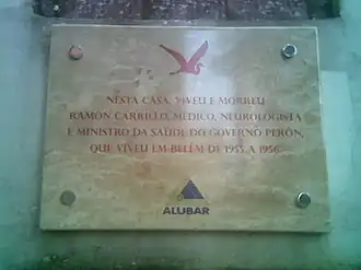Plaque commémorative apposée sur la façade de la maison où vécut Ramón Carrillo à Belém, dans le nord du Brésil.