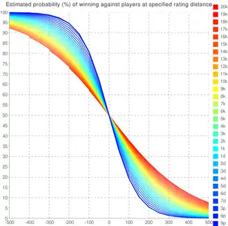 Les niveaux Elo sont conçus pour donner la probabilité de victoire (dans une partie à égalité) entre deux joueurs classés. Cette probabilité est censée ne dépendre que de l'écart entre les niveaux, mais en fait la distribution de probabilité sur un grand nombre de parties varie beaucoup d'un système à un autre et aussi en fonction du niveau des joueurs : entre professionnels, on s'attend à ce que les résultats soient beaucoup plus stables qu'entre joueurs amateurs faibles. La table suivante montre quelques différences entre le système de l'American Go Association[15], celui de la fédération européenne[13], et celui du serveur IGS[16].