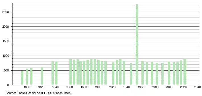 L'évolution du nombre d'habitants est connue à travers les recensements de la population effectués dans la commune depuis 1793. Pour les communes de moins de 10 000 habitants, une enquête de recensement portant sur toute la population est réalisée tous les cinq ans, les populations de référence des années intermédiaires étant quant à elles estimées par interpolation ou extrapolation[17]. Pour la commune, le premier recensement exhaustif entrant dans le cadre du nouveau dispositif a été réalisé en 2006[18].