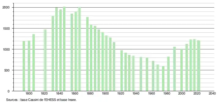 L'évolution du nombre d'habitants est connue à travers les recensements de la population effectués dans la commune depuis 1793. Pour les communes de moins de 10 000 habitants, une enquête de recensement portant sur toute la population est réalisée tous les cinq ans, les populations de référence des années intermédiaires étant quant à elles estimées par interpolation ou extrapolation[24]. Pour la commune, le premier recensement exhaustif entrant dans le cadre du nouveau dispositif a été réalisé en 2006[25].