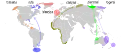 | Genre | Nom binominal, nom vernaculaire et auteur | Origine en France | Répartition géographique | Statut UICN mondial | Statut UICN France | Image |