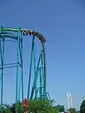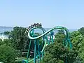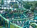 Raptor se situe juste à côté du Blue Streak. Les rails sont de couleur verte avec les supports bleu-vert.