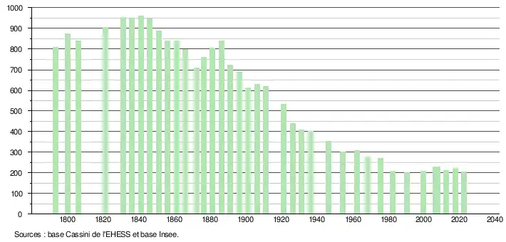 L'évolution du nombre d'habitants est connue à travers les recensements de la population effectués dans la commune depuis 1793. Pour les communes de moins de 10 000 habitants, une enquête de recensement portant sur toute la population est réalisée tous les cinq ans, les populations de référence des années intermédiaires étant quant à elles estimées par interpolation ou extrapolation[21]. Pour la commune, le premier recensement exhaustif entrant dans le cadre du nouveau dispositif a été réalisé en 2007[22].