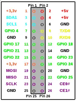 - 1 2 3 4 5 (en) « Raspberry Pi GPIO Connector », sur Elinux.org (consulté le ).