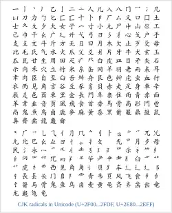 - ↑ CJK and KangXi Radicals: U+2E80–U+2FD5, The Unicode Standard, Version 5.2, pp394-395. Formes supplémentaires des clés CJC, p291-294 des tableaux de caractères.