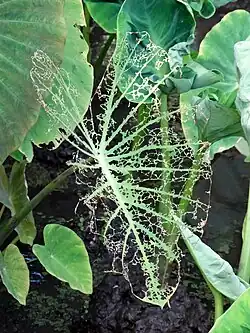 - Adoretus sinicus, insecte polyphage qui attaque les feuilles du taro dont il se nourrit[6].
