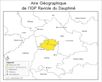La raviole du Dauphiné est fabriquée à Romans-sur-Isère (département de la Drôme, province du Dauphiné) et dans le Royans, région à cheval sur les départements de l'Isère et de la Drôme.