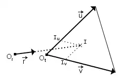 Un moyen simple et efficace pour calculer l'intersection d'un rayon avec un triangle consiste à calculer les coordonnées du point d'intersection I dans la base . Il suffit de résoudre l'équation vectorielle . À l'aide de la règle de Cramer, du produit mixte et en posant on obtient :