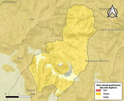 Le retrait-gonflement des sols argileux est susceptible d'engendrer des dommages importants aux bâtiments en cas d’alternance de périodes de sécheresse et de pluie[33]. 91,7 % de la superficie communale est en aléa moyen ou fort (59 % au niveau départemental et 48,5 % au niveau national)[Carte 4]. Depuis le , en application de la loi ELAN, différentes contraintes s'imposent aux vendeurs, maîtres d'ouvrages ou constructeurs de biens situés dans une zone classée en aléa moyen ou fort[Note 6],[34].