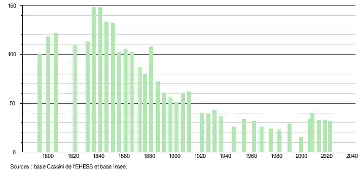 L'évolution du nombre d'habitants est connue à travers les recensements de la population effectués dans la commune depuis 1793. Pour les communes de moins de 10 000 habitants, une enquête de recensement portant sur toute la population est réalisée tous les cinq ans, les populations de référence des années intermédiaires étant quant à elles estimées par interpolation ou extrapolation[16]. Pour la commune, le premier recensement exhaustif entrant dans le cadre du nouveau dispositif a été réalisé en 2008[17].