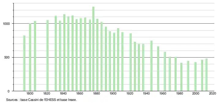 L'évolution du nombre d'habitants est connue à travers les recensements de la population effectués dans la commune depuis 1793. À partir du , les populations légales des communes sont publiées annuellement dans le cadre d'un recensement qui repose désormais sur une collecte d'information annuelle, concernant successivement tous les territoires communaux au cours d'une période de cinq ans. Pour les communes de moins de 10 000 habitants, une enquête de recensement portant sur toute la population est réalisée tous les cinq ans, les populations légales des années intermédiaires étant quant à elles estimées par interpolation ou extrapolation[2]. Pour la commune, le premier recensement exhaustif entrant dans le cadre du nouveau dispositif a été réalisé en 2007[3],[Note 1].