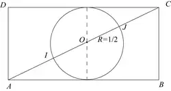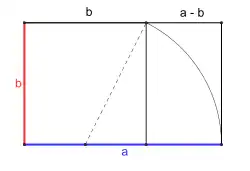 Cette méthode permet donc de construire un « rectangle d'or », c'est-à-dire un rectangle de longueur a et de largeur b tel que a et b soient en proportion d'extrême et de moyenne raison. En d'autres termes, un rectangle est dit d'or si le quotient de sa longueur par sa largeur est égal au nombre d'or. Mais pour tracer un rectangle d'or de largeur b, une méthode plus simple (cf. figure 3) est de dessiner un carré de côté b. En prenant le milieu de la base comme centre, on trace un cercle passant par les deux sommets opposés. L'intersection de ce cercle avec la droite prolongeant la base du carré détermine l'extrémité de la base a du rectangle d'or[b].