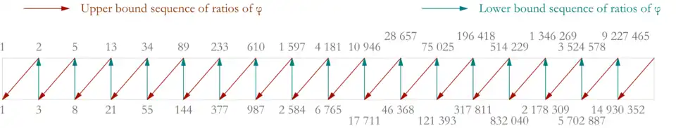 Le calcul des couples de numérateurs et dénominateurs obtenus par la fraction continue donne les valeurs suivantes (1, 1), (2, 1), (3, 2), (5, 3), … le dénominateur correspond au numérateur de la fraction précédente. Il est aussi égal au n-ième terme de la suite de Fibonacci (Fn). Elle est définie par récurrence :