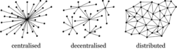 Différence entre une architecture centralisée (centralised), décentralisée (decentralised) et distribuée (distributed).