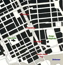 Alors que le Norrmalm du XVIIe siècle s'est construit sans plan d'ensemble et ressemble de par son anarchie à la vieille ville, le gouverneur-général Clas Fleming imagine un plan en damier pour le quartier[6],[7]. Ces travaux de modernisation sont rendus nécessaires par l'expansion rapide de la capitale suédoise au temps de l'empire suédois. En 1636, l'expert en fortification Olof Hansson Örnehufvud est chargé par le gouvernement de créer « un plan tant pour les faubourgs que pour le centre-ville, qui élargisse les rues jusqu'aux limites du possible ». Les travaux de redéveloppement ont lieu pendant les décennies suivantes[8].