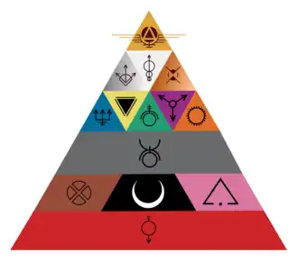 La Société mise en place par l'auteur s'organise sous forme d'une pyramide hiérarchique. Chaque classe est désignée par une couleur et un symbole, chargée d'un rôle précis et dénote par l'apparence : leurs yeux et parfois leurs cheveux sont à leur couleur, ils sont génétiquement modifiés pour exercer au mieux leurs activités. Le sommet de la pyramide est occupé par :