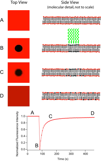 Lorsque l'on a une distribution homogène d'une population moléculaire fluorescente, on peut inhiber de manière irréversible sa fluorescence dans une zone restreinte de l'échantillon par photoblanchiment à l'aide d'un flash lumineux obtenu en exposant très brièvement cette zone avec un laser. On crée ainsi deux populations de molécules (une fluorescente l'autre pas) spatialement distinctes. Si les molécules sont capables de se déplacer dans le milieu, on assiste à une redistribution des deux populations entre la zone blanchie et le milieu adjacent jusqu'à l'homogénéisation des populations : la zone blanchie -- ou bleachée -- redevient progressivement fluorescente. L'analyse de la cinétique de récupération de fluorescence permet de déduire le coefficient de diffusion latérale « D », caractéristique de la vitesse de déplacement des molécules dans le milieu (plus la vitesse de diffusion est élevée plus la fluorescence ré-augmente rapidement).
