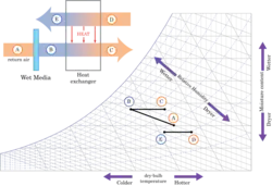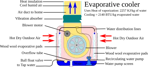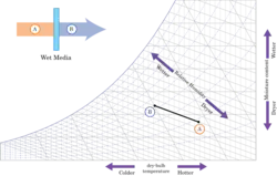 Les refroidisseurs à évaporation abaissent la température de l'air selon le principe du refroidissement par évaporation, contrairement aux systèmes de climatisation typiques qui utilisent réfrigération à compression de vapeur ou la réfrigération par absorption. Le refroidissement par évaporation est la conversion de l'eau liquide en vapeur à l'aide de l'énergie thermique contenue dans l'air, ce qui entraîne une baisse de la température de l'air. L'énergie nécessaire à l'évaporation de l'eau est prélevée dans l'air sous forme de chaleur sensible, qui affecte la température de l'air, et convertie en chaleur latente, l'énergie présente dans la composante vapeur d'eau de l'air, l'air restant à une valeur constante enthalpique. Cette conversion de la chaleur sensible en chaleur latente est connue sous le nom de processus isenthalpique parce qu'elle se produit à une enthalpie constante. Le refroidissement par évaporation provoque donc une baisse de la température de l'air proportionnelle à la chute de chaleur sensible et une augmentation de l'humidité proportionnelle au gain de chaleur latente. Le refroidissement par évaporation peut être visualisé à l'aide d'un tableau psychrométrique en trouvant la climatisation initiale et en se déplaçant le long d'une ligne d'enthalpie constante vers un état d'humidité supérieure[10].