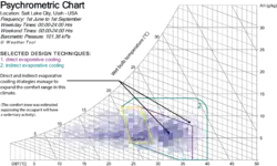 La figure montrant les données météorologiques de Salt Lake City représente le climat estival typique (de juin à septembre). Les lignes colorées illustrent le potentiel des stratégies de refroidissement par évaporation directe et indirecte pour élargir la plage de confort en été. Elle s'explique principalement par la combinaison d'une vitesse d'air plus élevée d'une part et d'une humidité intérieure élevée lorsque la région permet la stratégie de refroidissement par évaporation directe d'autre part. Les stratégies de refroidissement par évaporation qui impliquent l'humidification de l'air devraient être mises en œuvre dans des conditions sèches où l'augmentation du taux d'humidité reste inférieure aux recommandations pour le confort des occupants et la qualité de l'air intérieur. Les tours de refroidissement passif n'ont pas le contrôle que les systèmes traditionnels de CVC offrent aux occupants. Cependant, le mouvement d'air supplémentaire fourni dans l'espace peut améliorer le confort des occupants.
