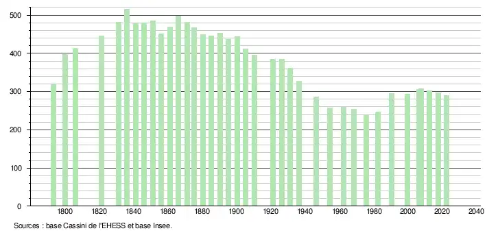 L'évolution du nombre d'habitants est connue à travers les recensements de la population effectués dans la commune depuis 1793. Pour les communes de moins de 10 000 habitants, une enquête de recensement portant sur toute la population est réalisée tous les cinq ans, les populations de référence des années intermédiaires étant quant à elles estimées par interpolation ou extrapolation[16]. Pour la commune, le premier recensement exhaustif entrant dans le cadre du nouveau dispositif a été réalisé en 2007[17].