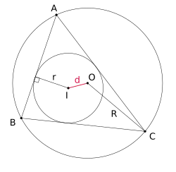 Pour un triangle quelconque, on note O, I, IA les centres respectifs des cercles circonscrit, inscrit, et exinscrit dans l'angle (par exemple), et R, r, rA leurs rayons respectifs.