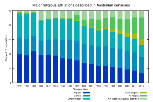 Les divisions religieuses en Australie avaient tendance à refléter l'héritage politique de la Grande-Bretagne et de l'Irlande. Jusqu'en 1945, la grande majorité des catholiques d'Australie étaient d'origine irlandaise, ce qui a amené la majorité britannique à remettre en question leur loyauté envers l'Empire britannique. Les premiers prêtres catholiques sont arrivés en Australie en tant que condamnés en 1800, mais la rébellion de Castle Hill de 1804 a alarmé les autorités britanniques et aucun autre prêtre n'a été autorisé dans la colonie jusqu'en 1820, lorsque Londres a envoyé John Joseph Therry et Philip Connolly[47]. En 1901, la Constitution australienne garantit la séparation de l'Église et de l'État. Une période notable de sectarisme a réapparu pendant la Première Guerre mondiale et le soulèvement de Pâques de 1916 en Irlande[44], mais l'importance de la division religieuse a considérablement diminué après la Seconde Guerre mondiale. Il y a eu une croissance de l'appartenance non religieuse, mais aussi une diversification des Églises chrétiennes (en particulier la croissance des églises orthodoxes grecques, macédoniennes, serbes et russes), ainsi qu'une augmentation de l'œcuménisme parmi les chrétiens, à travers des organisations telles que le Conseil national de Églises en Australie[48].