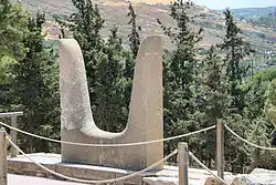 La manifestation symbolique des divinités à travers des objets associés à leur culte, est plus importante pour les Minoens que sa représentation directe[13]. Un des symboles les plus sacrés, en tous cas le plus fréquent[14], était la paire de cornes sacrées. Des cornes étaient installées sur les banquettes et les autels. Parfois, les cornes sont associées à des double-haches, des branches et des vases à libations. Ces cornes pouvaient être de toutes tailles : il existe des modèles réduits en terre cuite, en plâtre ou en pierre[15]. De toute évidence, ces cornes sont une représentation sommaire de la tête du taureau[16].