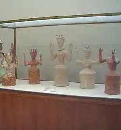 Les divinités étaient représentées par des statuettes de petites dimensions. Rares sont les statuettes de grandes dimensions, plus rares encore les statues cultuelles grandeur nature[69]. Une nouvelle tendance apparaît dans les années postpalatiales, où les statuettes en argile de grandes dimensions sont courantes[43]. Les déesses des sanctuaires postpalatiaux ont des têtes toujours couronnées d'emblèmes: oiseaux, cornes, coquelicots, et disques. Parfois des serpents dressent leurs têtes au-dessus du diadème[70]. À Gournia ont été découvertes des statuettes avec des serpents enroulés autour des bras, et un morceau de bras tenant une épée, enlacé d'un serpent. Une statuette de Gortyne tient des serpents dans ses mains tandis qu'un oiseau est perché sur son épaule. Ceci aurait tendance à montrer comme peu vraisemblable l'idée de deux déesses séparées, l'une céleste accompagnée de colombes, l'autre souterraine assistée de serpents.