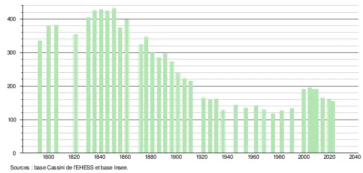 L'évolution du nombre d'habitants est connue à travers les recensements de la population effectués dans la commune depuis 1793. Pour les communes de moins de 10 000 habitants, une enquête de recensement portant sur toute la population est réalisée tous les cinq ans, les populations de référence des années intermédiaires étant quant à elles estimées par interpolation ou extrapolation[29]. Pour la commune, le premier recensement exhaustif entrant dans le cadre du nouveau dispositif a été réalisé en 2004[30].