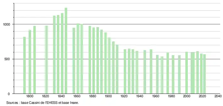 L'évolution du nombre d'habitants est connue à travers les recensements de la population effectués dans la commune depuis 1793. Pour les communes de moins de 10 000 habitants, une enquête de recensement portant sur toute la population est réalisée tous les cinq ans, les populations de référence des années intermédiaires étant quant à elles estimées par interpolation ou extrapolation[32]. Pour la commune, le premier recensement exhaustif entrant dans le cadre du nouveau dispositif a été réalisé en 2008[33].