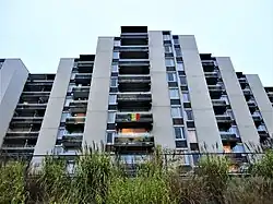 - Le bâtiment est entouré d’espaces verts qualitatifs, utilisables par les habitants de l’immeuble mais également ceux du voisinage[7].La structure est faite d’un système modulé, pour une économie de moyens, avec l’utilisation du béton banché par coffrage tunnel. Certaines parties sont bardées de profilés d’aluminium pré-laqué comprenant l’isolation thermique, matériau récemment mis sur le marché au moment de la construction.